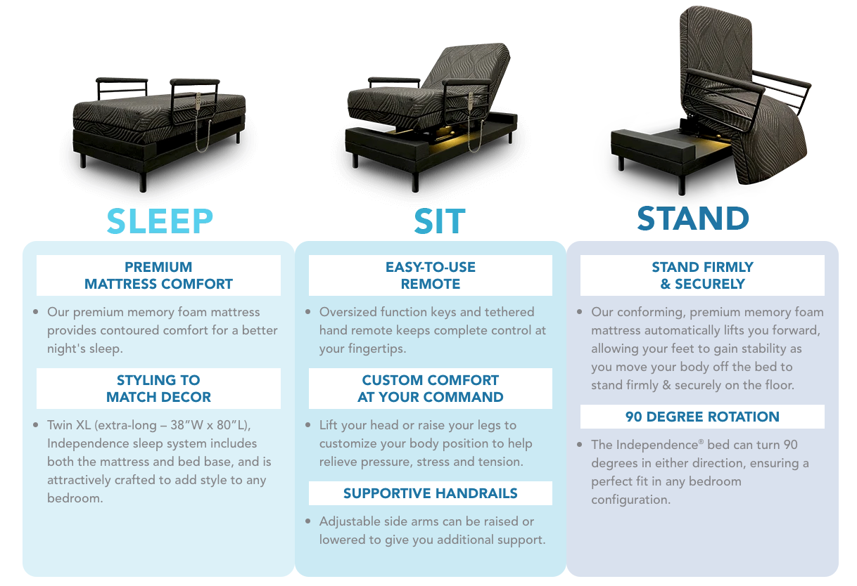 Our mission at Customatic® Technologies is to provide a sense of relief, confidence and independence by making getting in and out of bed the easiest part of your day. The Independence® sleep system rotates 90 degrees and gently lifts you up into a standing position. Our premium memory foam mattress provides contoured comfort for a better night's sleep. If you have impaired mobility or other physical challenges, reclaim your independence with our bed--after experiencing it, we are confident you will say, “I LOVE MY INDEPENDENCE™."